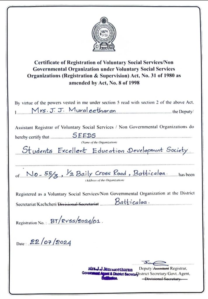 கடந்த சில வருடங்களாக பின்தங்கிய கிராமங்களில் வாழும் மாணவர்களின் கல்வி நடவடிக்கைகளில் பல முன்னேற்றங்களை ஏற்படுத்திவரும் எமது அமைப்பானது, உத்தியோகபூர்வமாக மாவட்ட மட்டத்தில் பதிவுசெய்யப்பட்டு (22. 07. 2024) இன்றிலிருந்து மேலும் பல செயற்பாடுகளை புது உத்வேகத்துடன் ஆரம்பிக்க தயாராகிவருகின்றது.